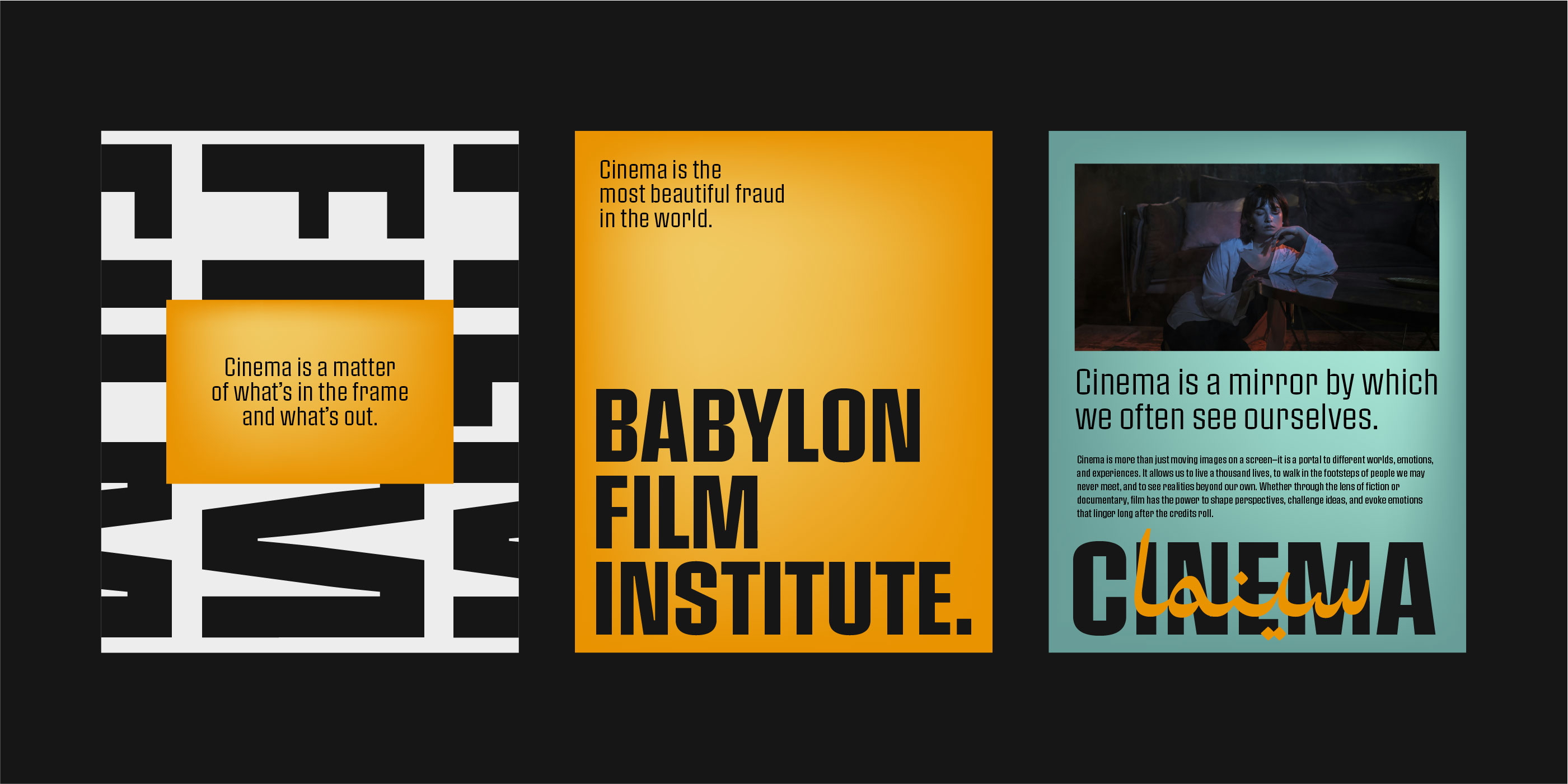 For the Babylon International Documentary Festival, we crafted a visual identity that seamlessly blends Arabic design and typography with contemporary English elements, all presented in a minimalist style. Drawing inspiration from the iconic Ishtar Gate, our logo embodies the rich cultural heritage of Babylon while maintaining a modern and cinematic aesthetic. The overall identity reflects the dynamic, storytelling nature of the documentary world, with a focus on simplicity, elegance, and cinematic appeal, making it both timeless and memorable.