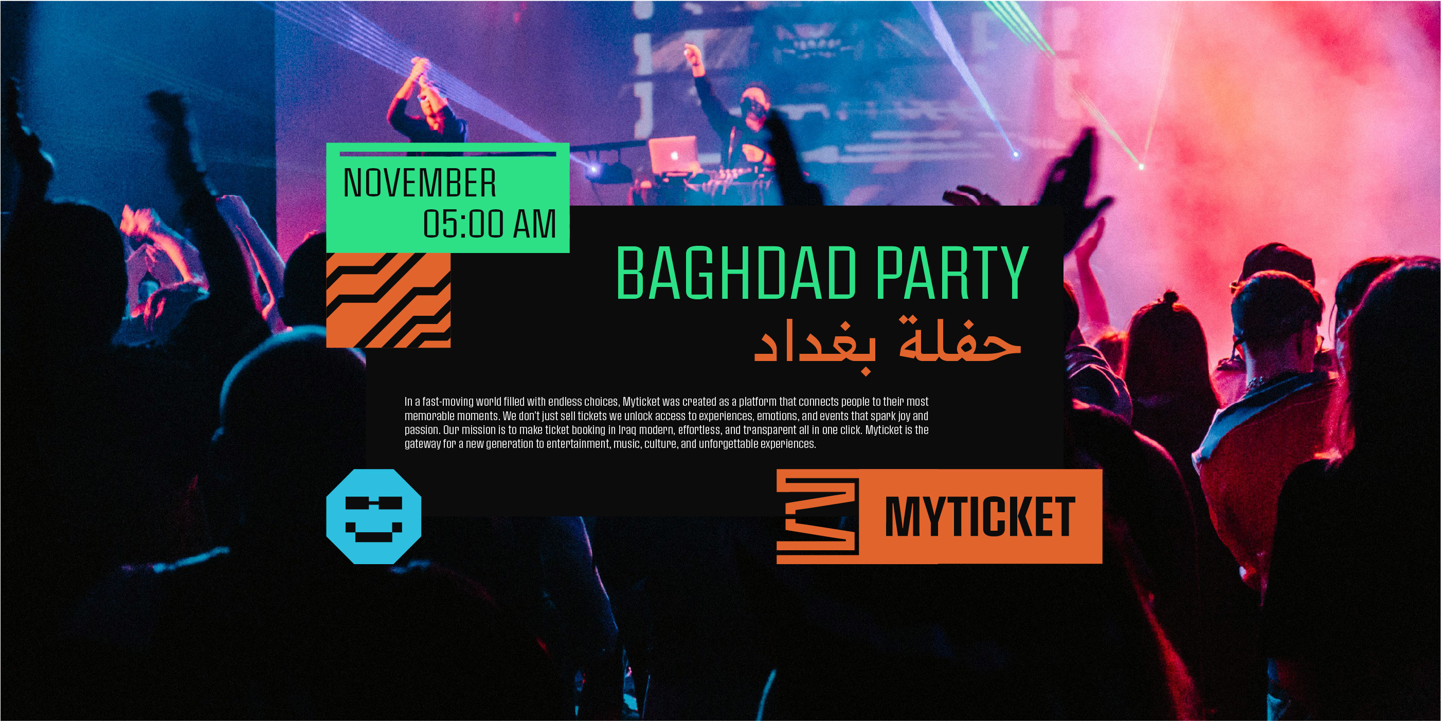 In a fast-moving world filled with endless choices,Myticket was created as a platform that connects peopleto their most memorable moments. We don’t just selltickets we unlock access to experiences, emotions, andevents that spark joy and passion. Our mission is tomake ticket booking in Iraq modern, effortless, andtransparent all in one click. Myticket is the gateway fora new generation to entertainment, music, culture, andunforgettable experiences